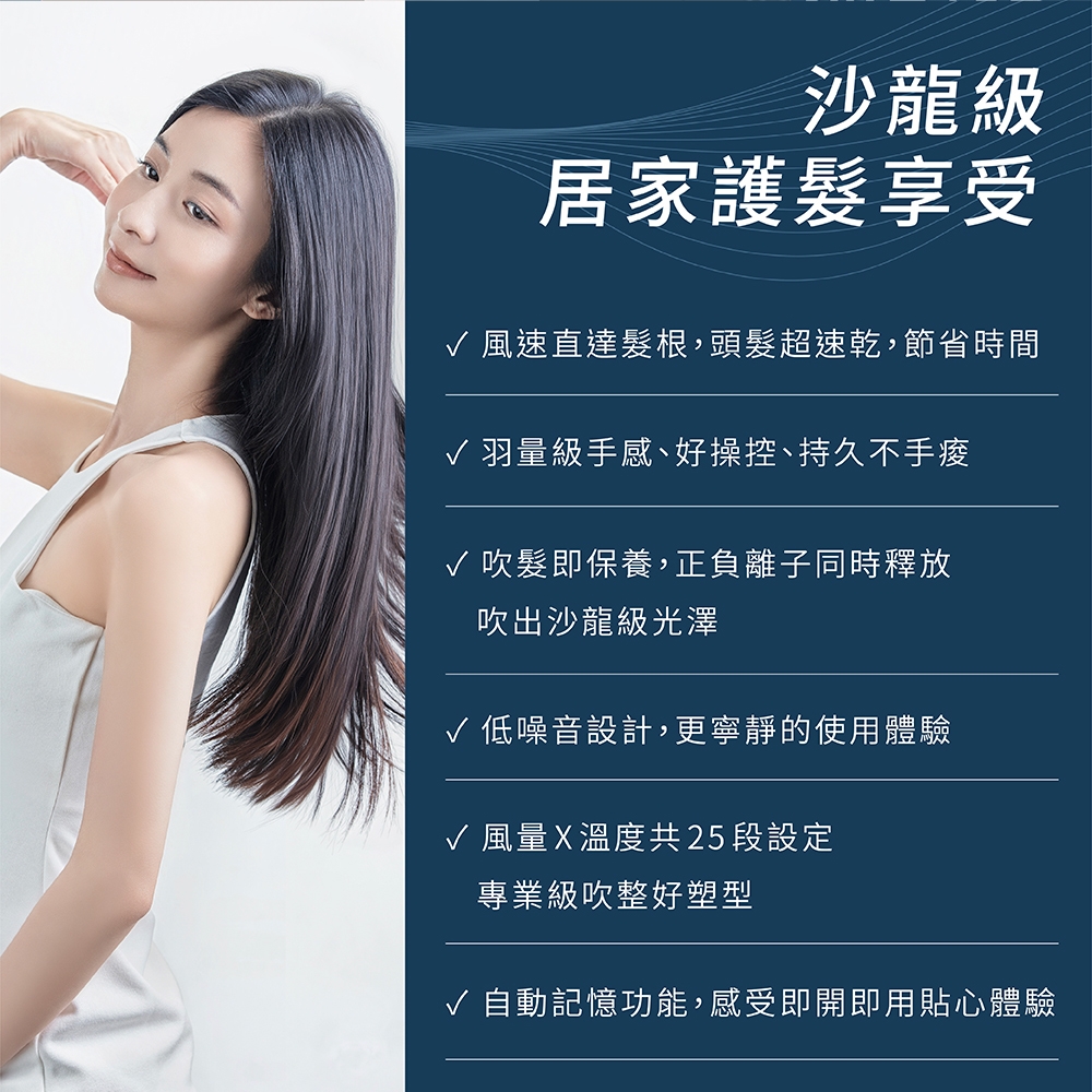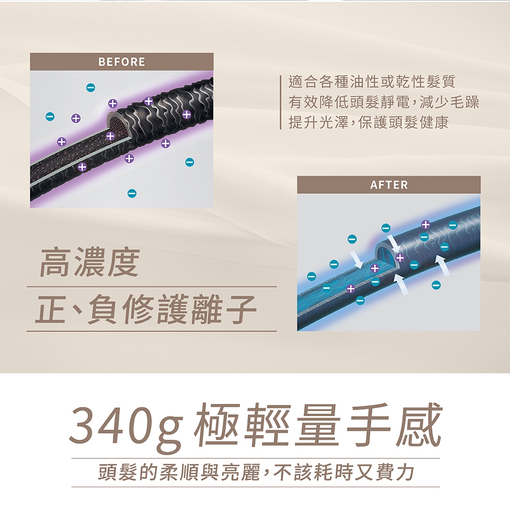 ・高濃度千萬負離子、正離子達到「修護光澤水潤髮絲」效果